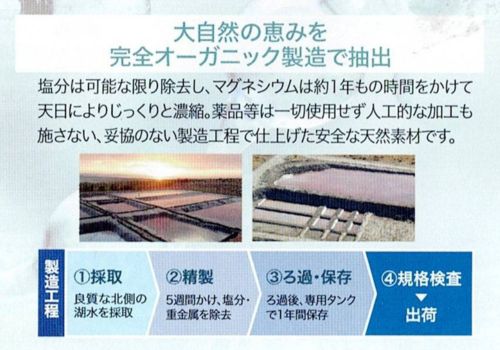 市販のミネラルウォーターには一定のミネラルが含まれているものもありますが、それだけで必要なミネラルが摂取できるということではありません。人体には様々なミネラルが必要ですが、中でも現代人はマグネシウムが特に不足しているといわれています。健康、そして生命維持に欠かせないマグネシウムを毎日摂取していくことをおすすめしています。